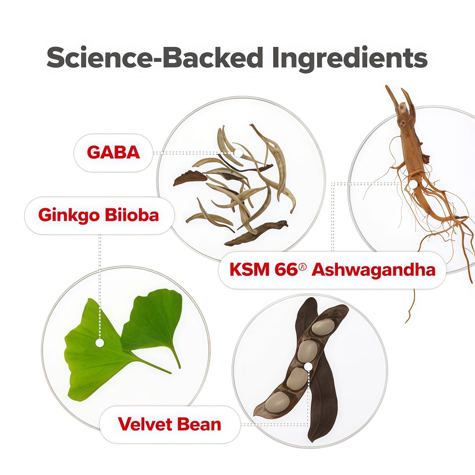 KSM-66° Ashwagandha and GABA are clinically studied to support a healthy mood &relaxation-so you can ease out of overthinking and slide into connection. Velvet Bean contains precursors to dopamine (the “feel good" chemical) so you're not just physically ready... you're yearning for it, too.